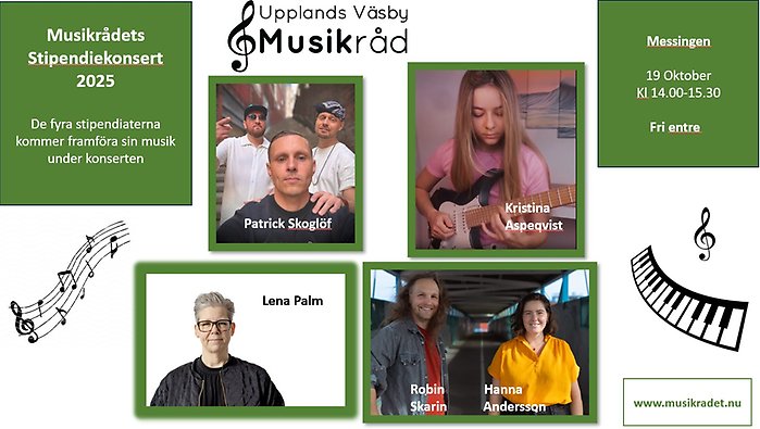 Välkommen till Musikrådets årliga stipendiekonsert med årets stipendiater Patrick Skoglöf, Lena Palm, Kristina Aspeqvist och duon Hanna och Robin. Ingen föranmälan krävs.